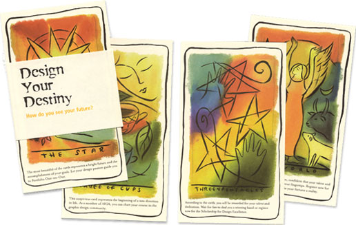 To engage students in the process of charting their careers, we called upon a traditional fortune-telling method, tarot cards to serve as inspiration for the invitation to Portfolio One-on-One. Illustrations by Jane Mjolsness