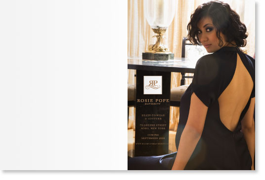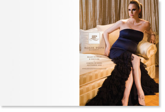 The Rosie Pope mark and classic typography complement the photography and allow the beautiful ready-to-wear and couture dresses to have maximum impact.